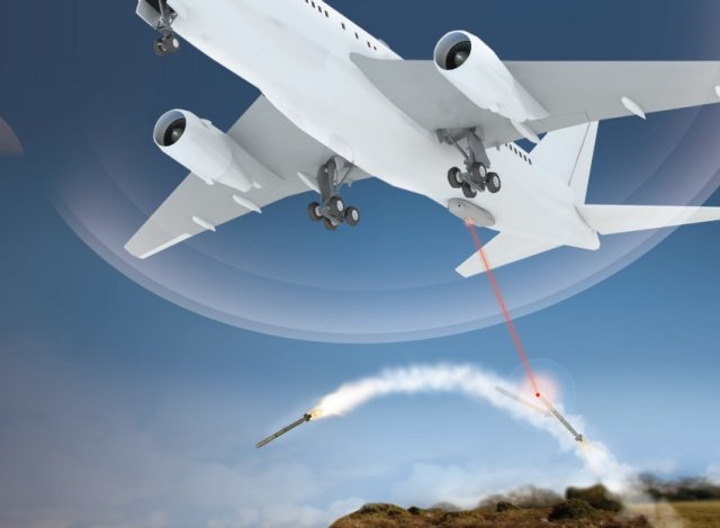 图6:固定在飞机底部的直接红外对抗(DIRCM)系统的示意图示例。被中红外SC光源遮盖的导弹偏离了其轨迹,并没有击中目标。